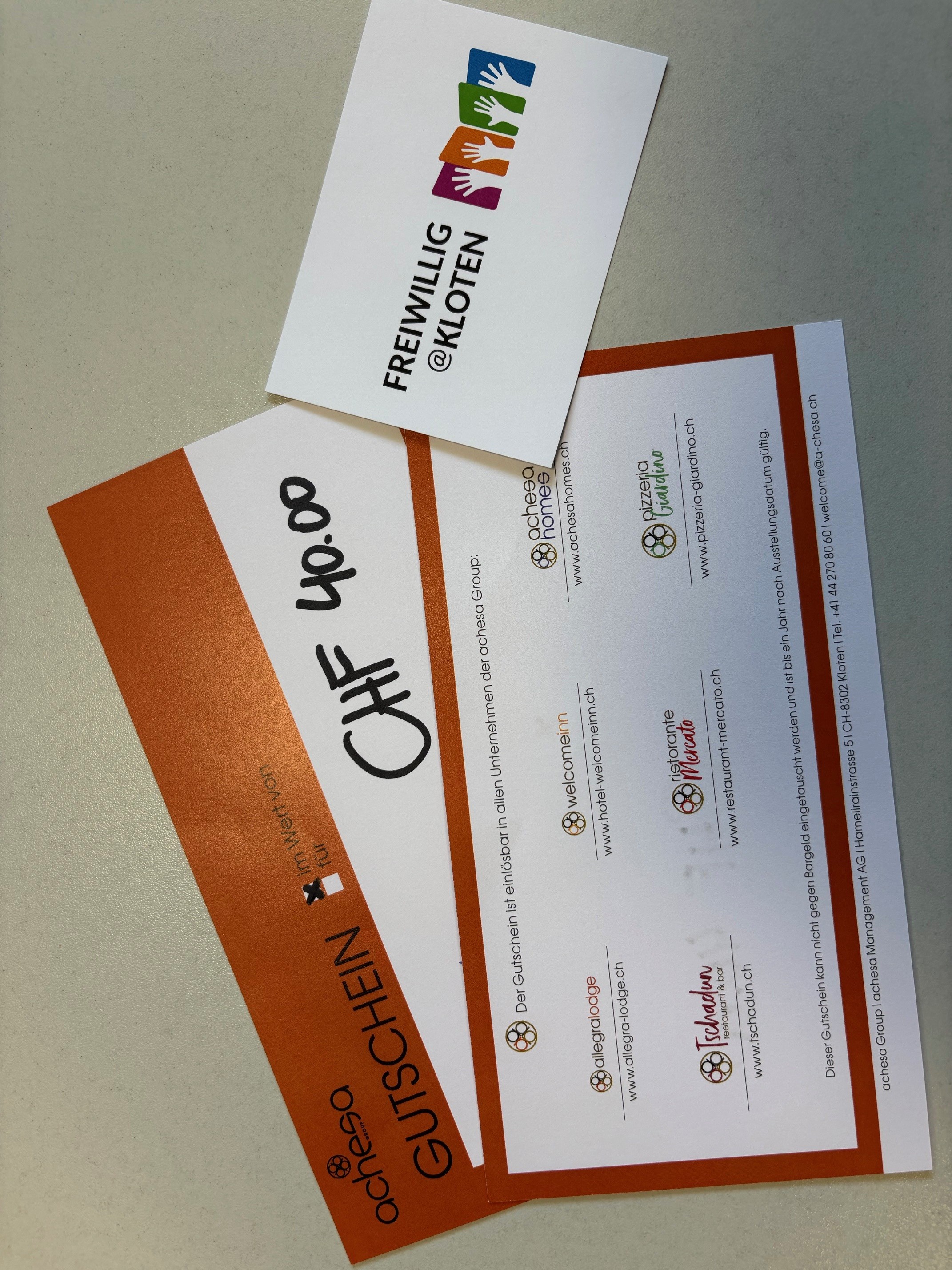 Die Gewinner erhalten je einen Gutschein à CHF 40, einlösbar in allen Restaurants der achesa Group, z.B. in der Pizzeria Giardino oder im Ristorante Mercato. Ein herzliches Dankeschön an die achesa Group für die grosszügige Unterstützung der Freiwilligenarbeit in Kloten!